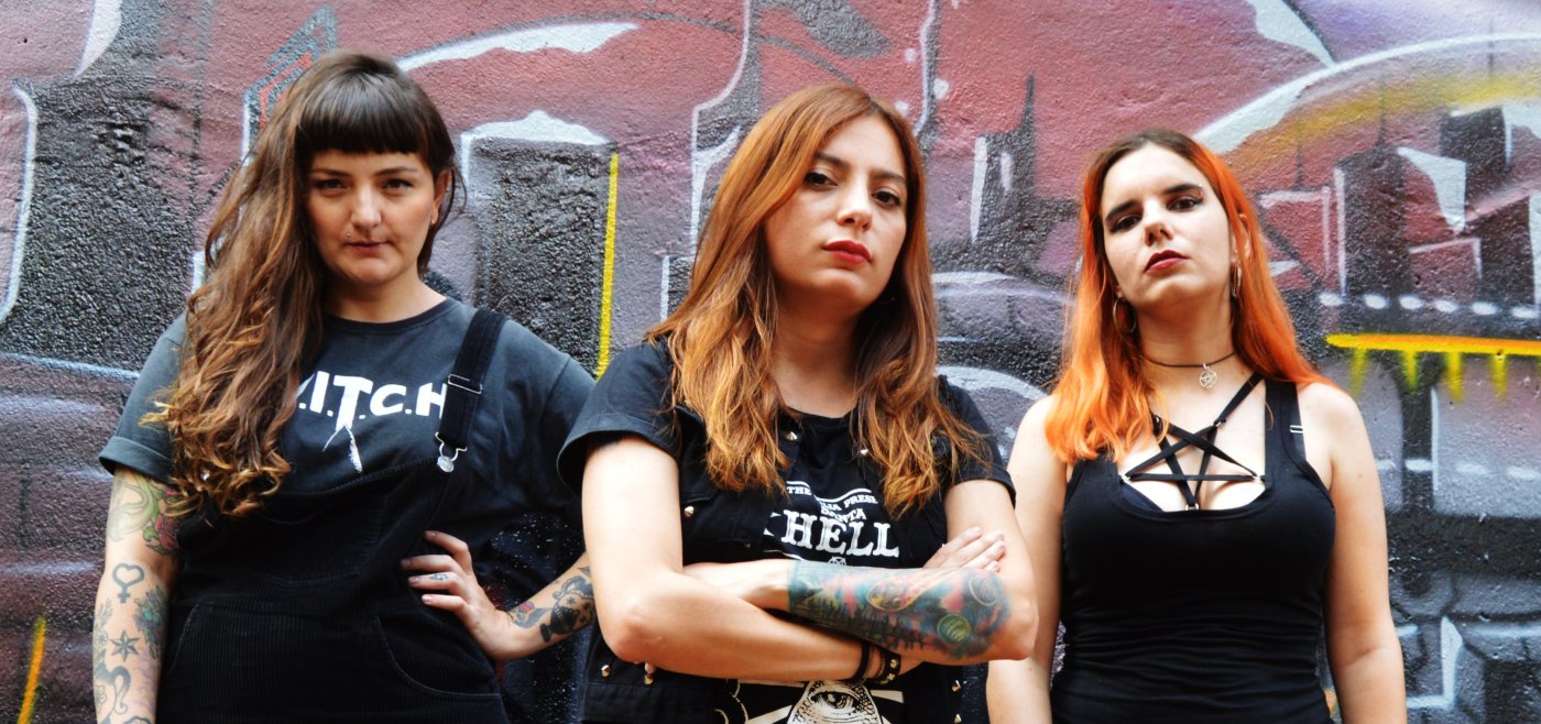 The São Paulo three-piece of Renata Petrelli (guitar and vocals), Aline Dutchi (bass and backing vocals) and Leonora Mölka (drums) formed last year with a focus on creating what Renata describes to us as “thrash and not that much with a guttural voice.”